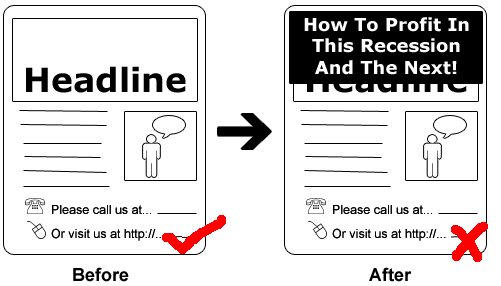 1) The 'recession' headline: No doubt you have seen such headlines all over the place, in e-mails, newspapers etc. for all kinds of programs. I can tell you it is unoriginal, it sucks, too overused and gives a "jump on bandwagon" impression. Seth Godin is right: All marketers are liars.